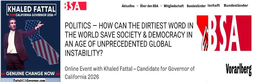 Politics — How Can the Dirtiest Word in the World Save Society & Democracy in an Age of Unprecedented Global Instability? | Online Event with Khaled Fattal – Candidate for Governor of California 2026, Hosted by BSE of Austria.
