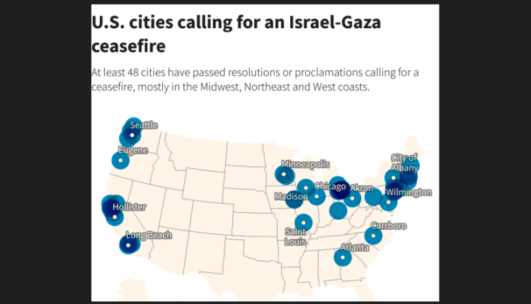 At least 48 cities have passed symbolic resolutions calling for a halt to Israel’s Gaza bombardment, with six others passing resolutions advocating more broadly for peace. At least 20 have passed resolutions condemning Hamas’ Oct. 7 attack on Israel, which sparked the current bloodshed, the data shows.